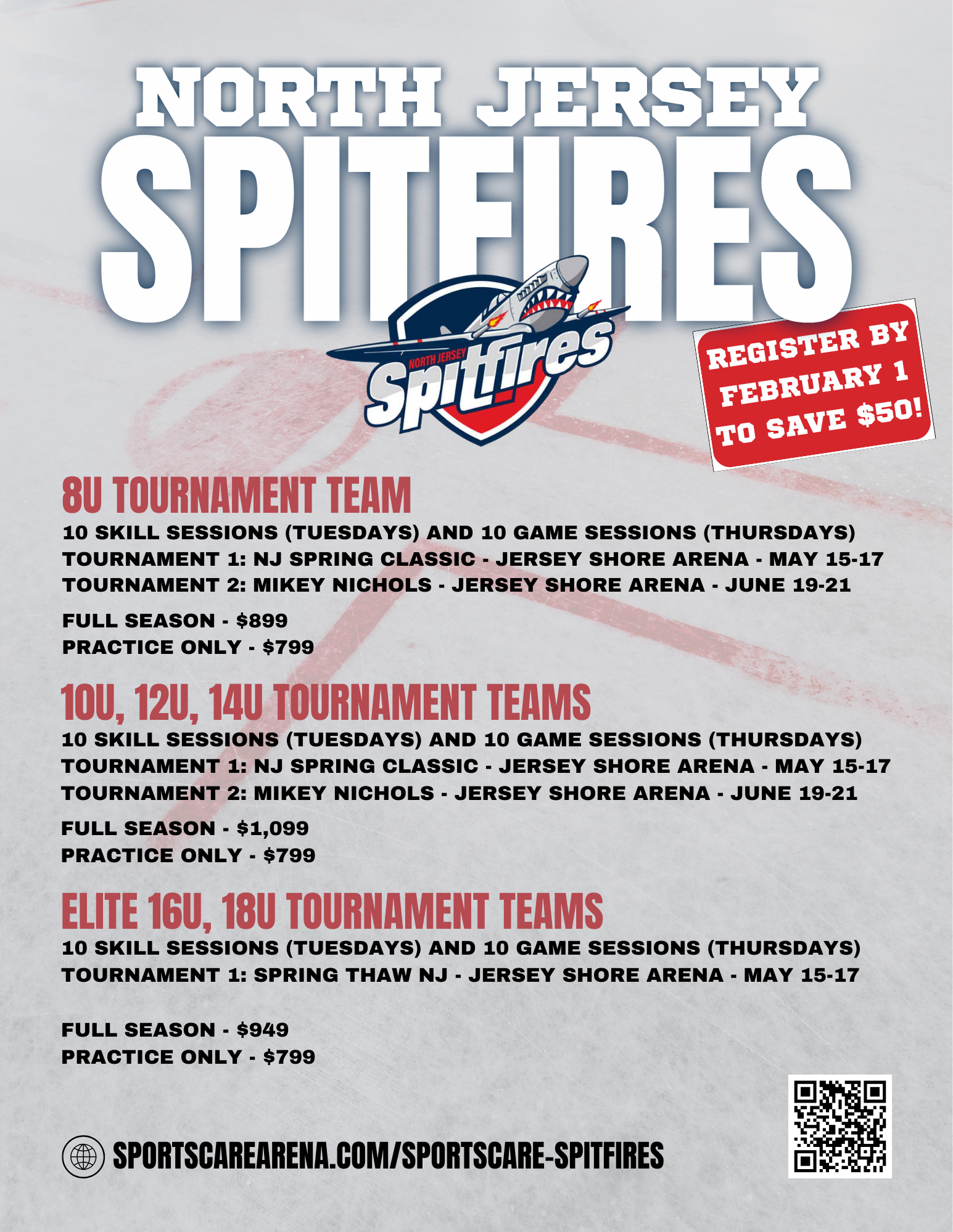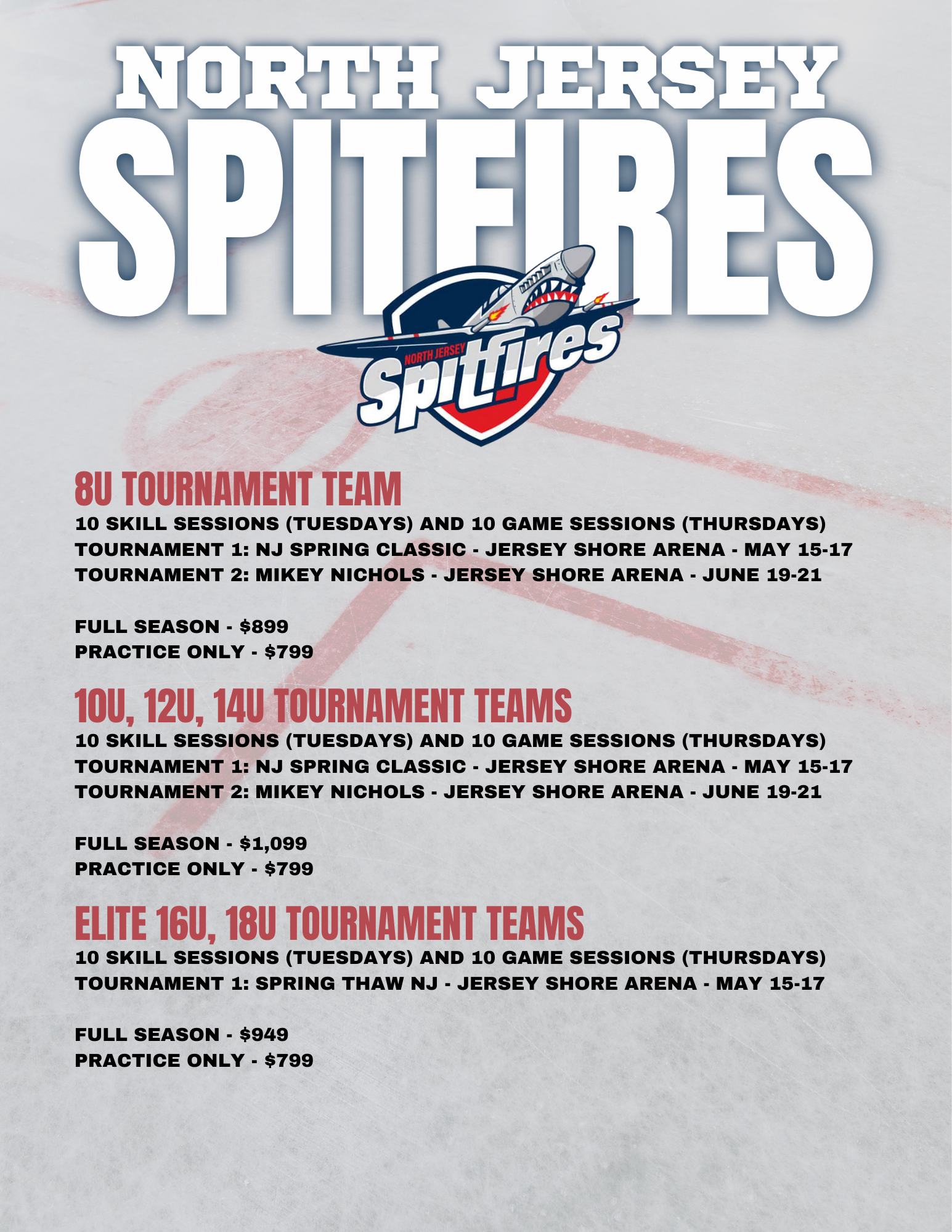 The North Jersey Spitfires Spring program is for hockey players looking to practice and compete in two or more tournaments this off-season. The program is designed to improve individual skill development and teach players various hockey concepts that will translate into becoming a better player. The North Jersey Spitfires program is led by SportsCare Arena Hockey Coaches Bobby Jones and Steven Jones, and will include a number of other experienced coaches that are focused on player development.